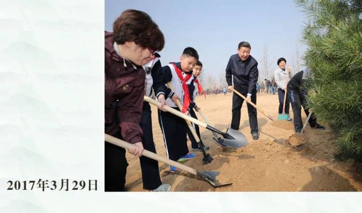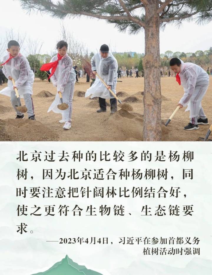 率先垂范、身体力行。此后13个春天,习近平总书记坚持同干部群众一起参加义务植树活动。永定河畔的滨水绿廊,城市副中心的绿心公园,产业疏解后改造的开放绿地,环境整治后打造的生态空间,都曾见证总书记躬身植绿的身影。